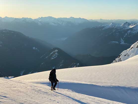 Francis leading our way onto the glacier with The Flames and Ember Mtn. ahead