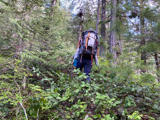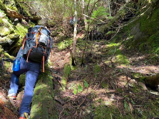 Alex traversing/bushwhacking above the gully. This part was unpleasant.