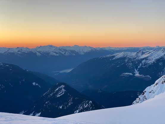In the pitch dark we descended slightly onto the frozen lake immediately below our camp and plodded across the lake. The far (north) end of the lake had a bit of micro-terrain that wasn’t very obvious in the dark. We ended up traversing a bit farther than needed but we did find an efficient way to traverse into the foreshortened gully that would eventually lead us onto Terrarosa Glacier. Through this gully we ascended 300 m elevation on firm and crusty snow and then we popped out onto the icefield still in pitch dark. The plod across the icefield towards Ember Mountain’s SE slopes was longer than it looked. The ascent of Ember Mtn. was also trickier than expected with one steep roll that was on the edge of the capability of our snowshoes. The slope angle was approaching 40 degrees on a couple rolls and the conditions were rather icy. We made the summit about 15 minutes before sunrise so we got a full show from alpenglow to the golden glow. Two of us even caught cell phone reception on this remote summit and I updated my peakbagger app…