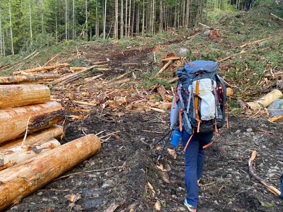 The plan was to wake up at 6 am but at 4 am logging trucks came to wake us up. I thought we were seriously screwed but Francis went out to talk to the guy and they actually allowed us to camp/park in their work zone. What a pleasant surprise. I still do not get why they were logging at 4 am on a long weekend Saturday but I guess they needed money really badly…. The consistent noise meant we could no longer sleep so by 5 am we might as well just get up and go. The lowest 100 m was messed up by the logging so we just walked on the newly-built roads. We did not walk to the very end as one machine was working to push the road even further and we didn’t want to directly encounter that guy (who wasn’t the person Francis talked to earlier). We bailed into the forest on climber’s left and soon started to just follow Matt’s GPS track. The route was obvious as we were ascending a rib feature for a while until directly underneath some imposing bluffs. The bluffs forced us to ascend a traversing line towards climber’s left and at the end of this traverse we scrambled through the “keyhole gully” that was mostly 3rd class on tree roots. That was the critical point of the “Juhasz Route” as this gully offers the only possible break through the forested bluffs. Once above the gully we maintained a diagonal bearing out to climber’s left. The terrain forced us to shoot straight the hell up but the GPS track told us to traverse left, so this next section needed some high concentration on route-finding and substantial bushwhacking. After about 500 m elevation gain from the truck we came to the upper edge of the first cut-block and soon after, the second cut-block (all from heli-logging). Instead of following the GPS track through the second cut-block I led us hugging the upper edge while staying in the old growth forest. This proved to be mostly free of bushwhacking. At the edge of the third cut-block above 950 m we suddenly encountered snow. We boot-packed across to the left (west) side of this third cut-block, made a short detour to load up our water bottles and strapped the snowshoes on, and this was just under 1000 m elevation.