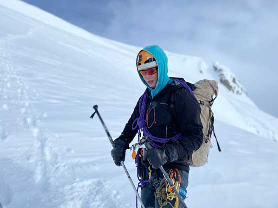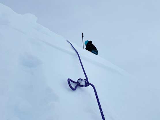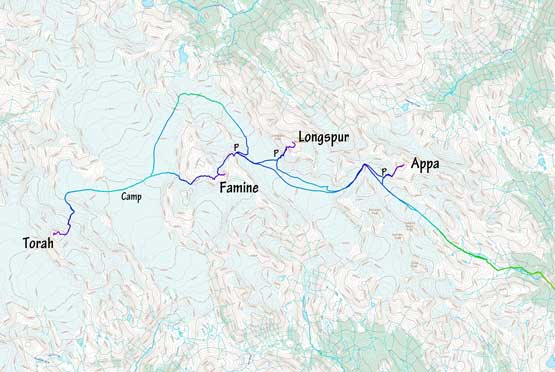 Descending following our own tracks was not a difficult task that in short time we had plunged back to the skis. There were three options to get to “Torah Peak” and our planned camping area, and we opted to stick with “plan A” in order to minimize the horizontal distance. I led us traversing/ascending another steep roll out to the west and then we entered the world of white-out again. The crux came shortly after as we down-climbed a pitch of 50-degree slope without being able to see much at all. I was leading in front bootpacking and roped up and all the sudden I started to slip into some steep terrain. I quickly stopped the slip and thought this would just be a wind drift or something, so continued down-climbing a few more meters until I realized it wasn’t really just a wind drift. I thought about to just climb back up, but I decided to ask for a body belay and continue down-climbing. About a pitch later the terrain angle eased and the visibility came back. We then did an easy-ish traverse aiming at some distant snowmobile tracks towards another shoulder/col on the west side of Famine Peak which would give us a passage to descend to the main glacier of Pemby Icecap.