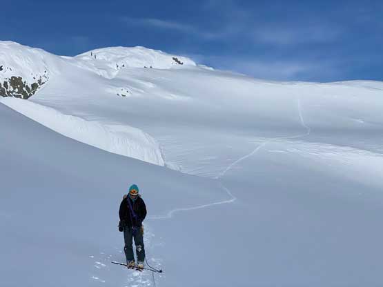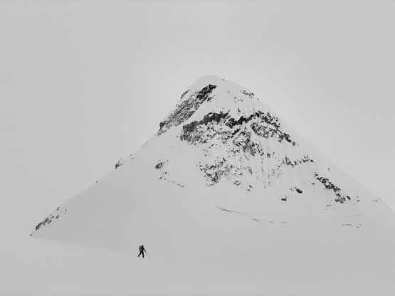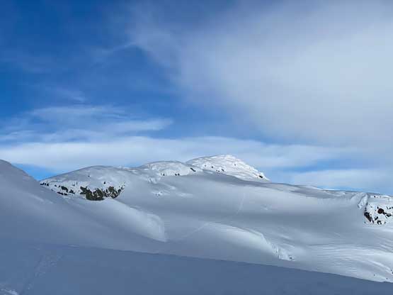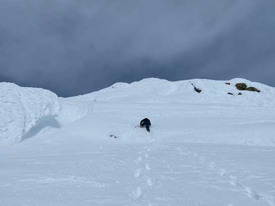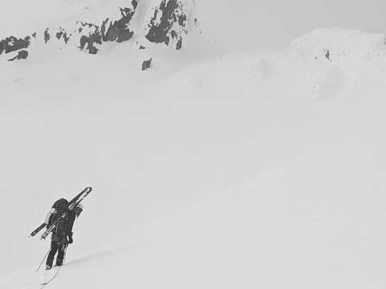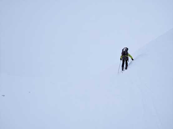 The weather had turned on us with light snow shower and not-so-great visibility and we weren’t even sure what would be the best route to reach “Famine col” between the main peak and a sub-summit to the west. I proposed a solution to aim for the shortest distance but that ended up bringing us to some steeper terrain. After ascending a steep roll we came to a steep traverse in flat-light conditions. Having only one ski pole I wasn’t even confident to skin across the steep slopes without being able to see much. I had to remove the skis and boot-pack a long ways losing a lot of precious elevation. Eric, being a much better skier, just side-hilled across and met me higher up near the col. At the col we found some snowmobile tracks indicating that our planned route to link up with Torah Peak would likely work out.