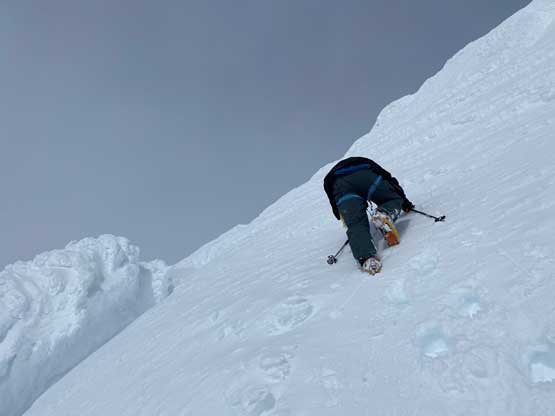 We ditched the skis and went for the short but steep 150-m ascent towards the summit. Again, there was no “beta” so we didn’t even know if it’s doable or not as the terrain looked insanely steep from our position. We strapped the crampons on but none of us had brought an ice axe. Eric led in front when the terrain became steep as he at least had a whippet. There were a few spots approaching 50-degrees but the terrain was never too exposed and the snow condition was excellent for kicking in. The climb turned not easier than appeared so we both topped out shortly after. The views weren’t great due to the clouds.