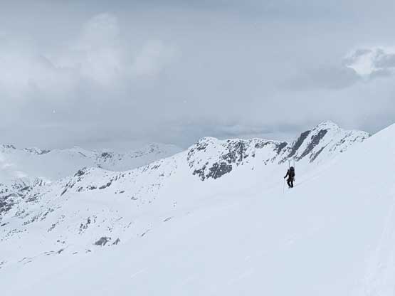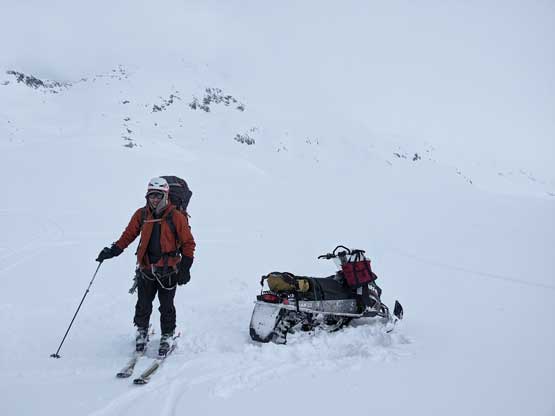 The weather had turned on us with light snow shower and not-so-great visibility and we weren’t even sure what would be the best route to reach “Famine col” between the main peak and a sub-summit to the west. I proposed a solution to aim for the shortest distance but that ended up bringing us to some steeper terrain. After ascending a steep roll we came to a steep traverse in flat-light conditions. Having only one ski pole I wasn’t even confident to skin across the steep slopes without being able to see much. I had to remove the skis and boot-pack a long ways losing a lot of precious elevation. Eric, being a much better skier, just side-hilled across and met me higher up near the col. At the col we found some snowmobile tracks indicating that our planned route to link up with Torah Peak would likely work out.