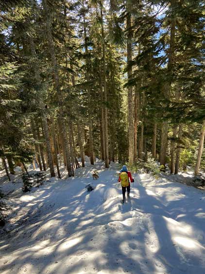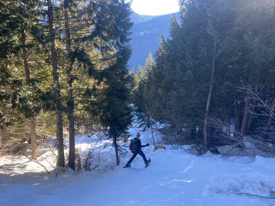We pressed on to finish this hike in a single push. Plodding up and over those undulating terrain was a little tiring but we managed to find a slightly more efficient line on the return. The steep forested descent wasn’t as bad as I thought as the snowpack was softening slightly to give easier purchase on the snowshoes. A combination of various “technical snowshoeing” techniques were applied that a few of us managed to descend this entire thing without taking the snowshoes off nor to use an ice axe. The last few klicks on the road seemed numbing but at least went by fast.