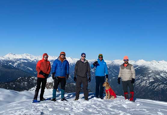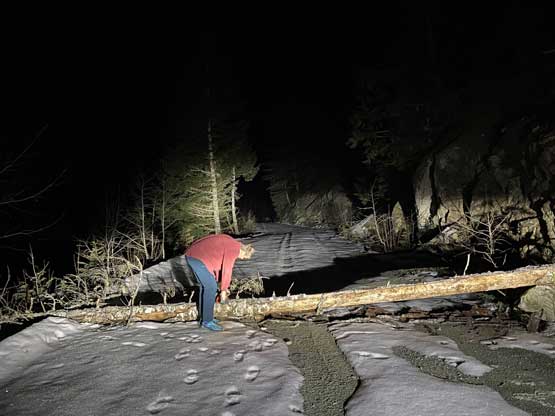 The 2AM wake-up call was pretty soft by the Midnight Crew’s standard. The drive from White Rock to North Vancouver added almost an extra hour for me. The five of us – Matt, Iliya, Sean, Ben and myself all piled into Matt’s full size truck at 3 am together with Matt’s dog and a couple hours later we had driven past Pemberton onto the In-SHUCK-ch FSR. Matt was able to cruise down the main line in almost 80 km/h for most of the stretch even in the dark. The drive on Fire Creek spur road was also more smooth than expected. Once past a junction to what seemed like a hydro project the road was no longer maintained. A downed tree could well deny our further access but Matt was smart enough to bring a chainsaw. Not far beyond the downed tree we encountered continuous snow with only faint sets of tire tracks, but Matt was able to push a few more kilometers up the road to around 520 m elevation, only a few more kilometers from where we “ideally” wanted to drive to. Thank to the smooth progress we had to start with head-lamps on.