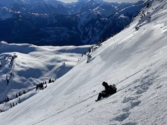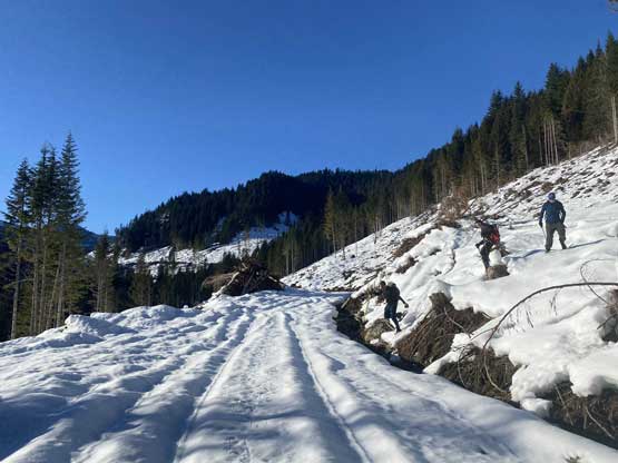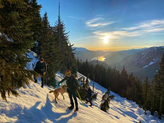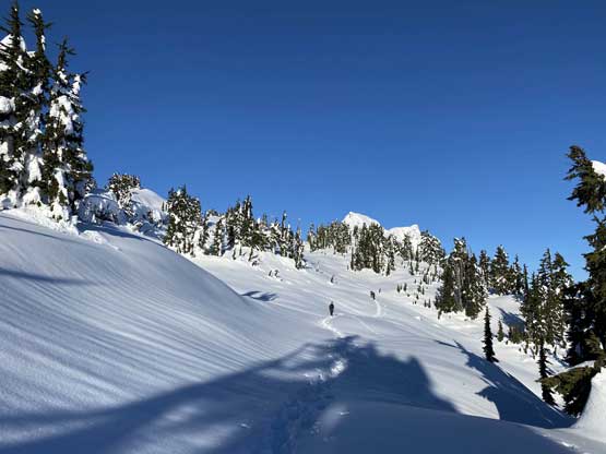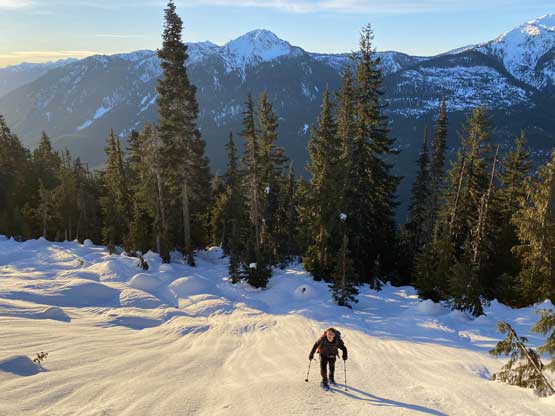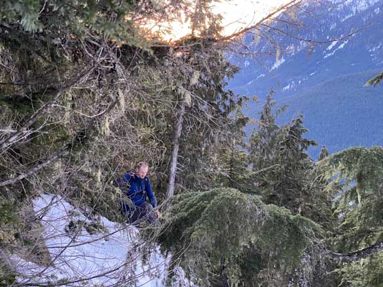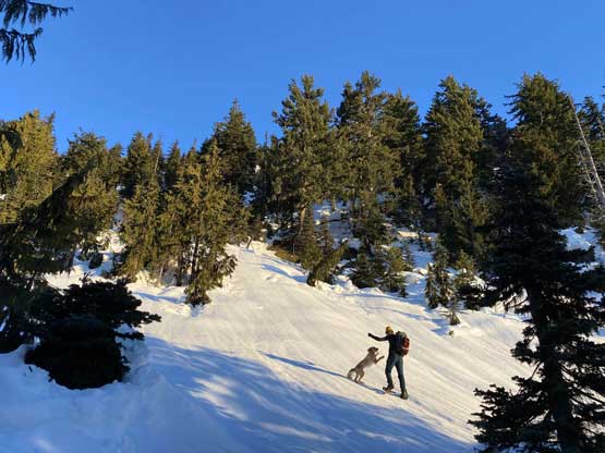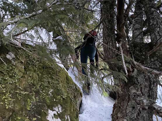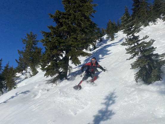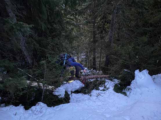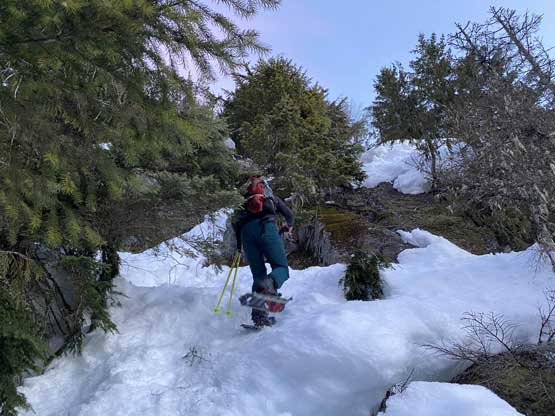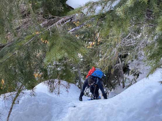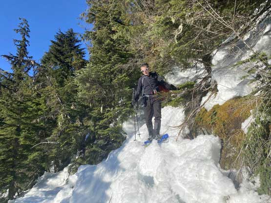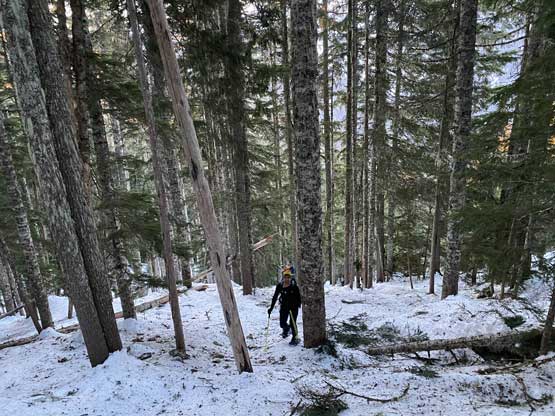The snow was deep enough on the road to use snowshoes right from the truck but we were able to just boot-pack it thank to the thick rain crust. Matt set up a blistering pace and in no time we were done with the road plodding. Into the forest we were able to continue boot-packing for about a hundred vertical meters before strapping snowshoes on. This also marked the spot where the light was finally bright enough to not require head-lamps anymore. The next 800 meters of elevation gain was mostly a straight-up shot in this increasingly steep forest (with some route-finding here and there) but the going was never too outrageous. I expected some real shit show but other than a few awkward spots around some bluffs we did not encounter any major obstacle. The supportive snowpack definitely helped. We cruised up to where they turned around last time in about an hour and half whereas it took them over 5 hours to reach that spot previously. Right around that section we ventured climber’s right into the mature forest briefly but the terrain kind of forced us to traverse back climber’s left into the younger trees. We encountered another steep zone in the next few hundred meters of gain with 40-degree and numerous bluffs to weave around, but again, our MSR snowshoes worked perfectly on the supportive crust that we were able to cruise up with no delay whatsoever.