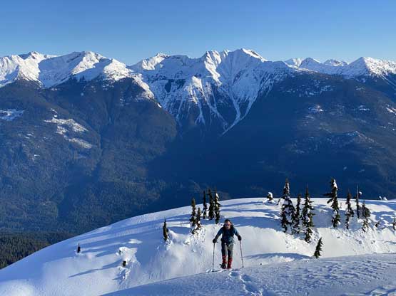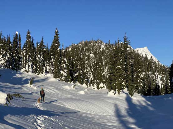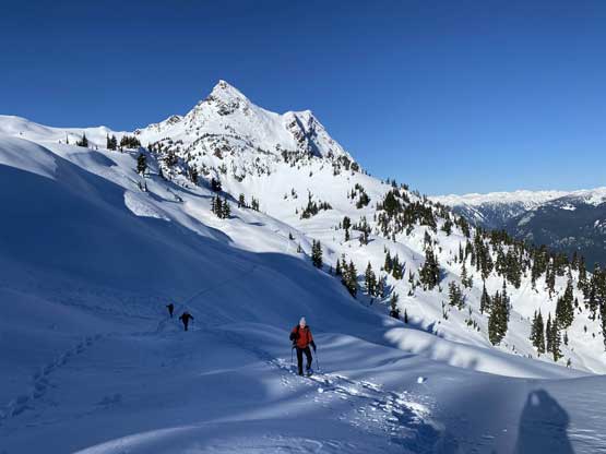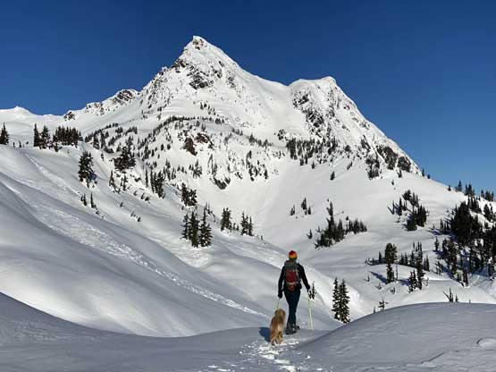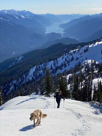 Iliya plodding up with “Speke Peak” on Nahatlatch/Lillooet Divide