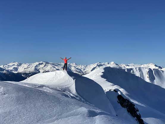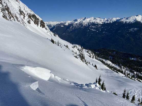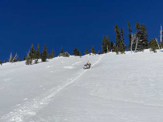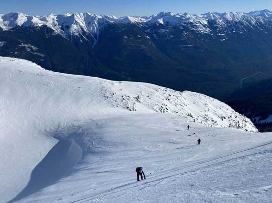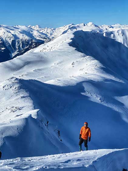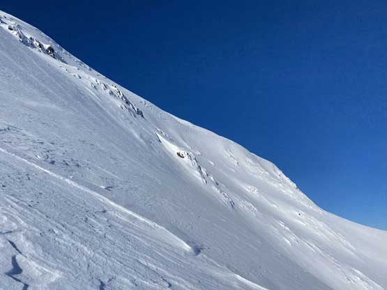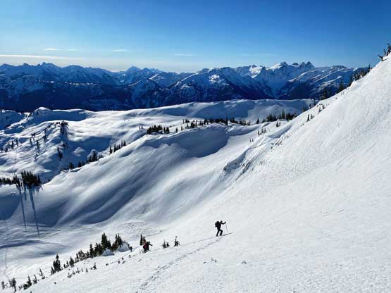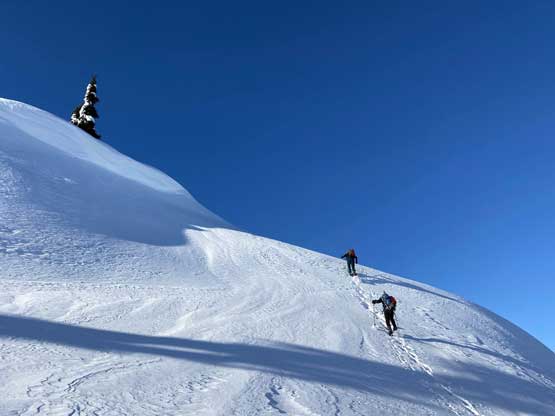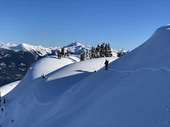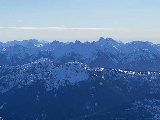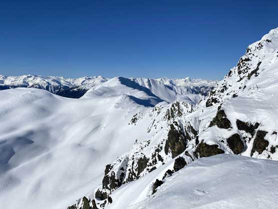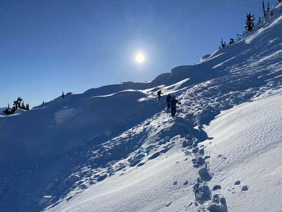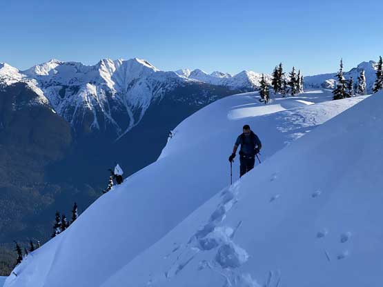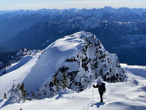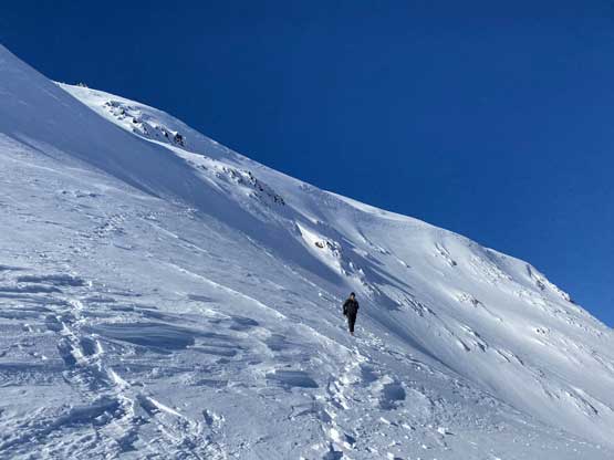 The attack of the summit block started with a section of steep “ridge crest feature” with some small cornices to be aware of and this zone ended at the base of the aforementioned “south side gully”. I took over the lead here putting some zig-zag tracks straight up the middle of this depression zone that maxed out near 40 degrees. At the top of this gully we veered left onto the east face and the next 100 m gain to reach the summit ridge involved more (unexpected) steep terrain. There was no obvious attack that looked tame and the line I chose started by a rightward traverse onto a massive hard-pressed windslab in search of the lowest angled terrain. Ascending this 40+ degree windslab forced me to take one snowshoe off and bootpack (others took their ice axes out). The grade petered out slightly after this rollover and I strapped the snowshoes back on and grunted onto the summit ridge. The traverse northwards to the true summit was pretty easy but very scenic.