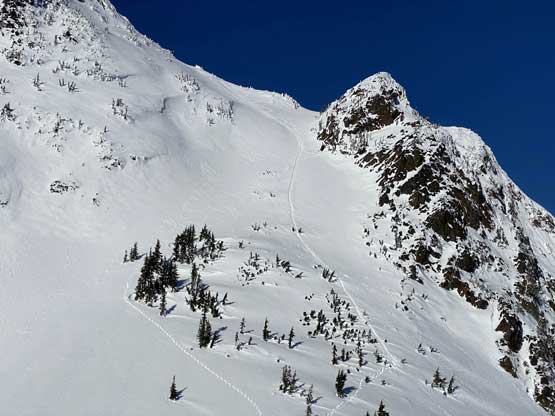 Once reaching the broad south-east ridge of the massif we took a longish break to regain some strength. For the next short stretch along the ridge we stayed generally to the right of the crest and encountered mostly open forest and easy terrain, until an abrupt drop forced use to ascend a steep roll to get onto the ridge crest. We were finally able to see the entire upper route at this point and made a final decision to use the “south side gully/ramp” to gain the east side of the summit block instead of the “SW chutes”. Once this decision was made we bailed off the ridge crest again with Matt leading across several steep traverses into the bowl south of the summit block. This stretch also involved at least 50 m of elevation loss and some undulating terrain.