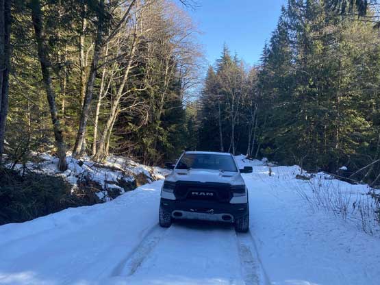 Our round trip time was 7 hours 20 minutes covering over one vertical mile of elevation gain on various terrain. Twenty minutes later Matt started up the truck. We had no problem turning around on this snowy road and a short while later we were down to the main In-SHUCK-ch FSR where Matt took off cruising north at 80-100 km/h. A long bumpy ride later we were back to Pemberton and another couple hours later we were back to North Vancouver. We stopped in Whistler for a proper restaurant dinner. I, unfortunately had one extra hour of driving as I live on the very southern part of Metro Van. only a few minutes away from U.S. border…