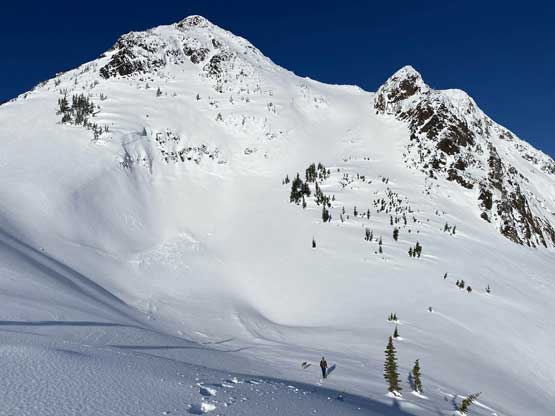 Fire Mountain sits roughly in the center of the loosely-defined region of “SW British Columbia”, about halfway down the In-SHUCK-ch and Harrison West logging roads system that connects Pemberton to Harrison Hotsprings. This is a very remote region and the round trip requires over 160 km of driving on logging roads no matter what direction one chooses to access from. Fire Mountain itself is not particularly tall by the South Coast standard, but stands out by over 1000 m prominence thank to the three deep valleys that surround the massif. The summit is mislabelled on the goverment’s topo map. The true summit is the eastern of the two peaks, which is unfortunately (or fortunately) more difficult than the officially-named west peak. To facilitate the steep forested approach one needs a thick snowpack to cover the underbrush but to ascend the true (east) peak safely one also needs a bomber snowpack stability, and combined with the ridiculously long backroads access this peak might not be as “simple” as one might expect.