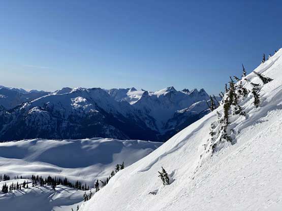 The attack of the summit block started with a section of steep “ridge crest feature” with some small cornices to be aware of and this zone ended at the base of the aforementioned “south side gully”. I took over the lead here putting some zig-zag tracks straight up the middle of this depression zone that maxed out near 40 degrees. At the top of this gully we veered left onto the east face and the next 100 m gain to reach the summit ridge involved more (unexpected) steep terrain. There was no obvious attack that looked tame and the line I chose started by a rightward traverse onto a massive hard-pressed windslab in search of the lowest angled terrain. Ascending this 40+ degree windslab forced me to take one snowshoe off and bootpack (others took their ice axes out). The grade petered out slightly after this rollover and I strapped the snowshoes back on and grunted onto the summit ridge. The traverse northwards to the true summit was pretty easy but very scenic.