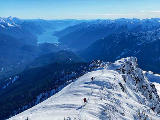 Matt and Iliya traversing the summit ridge with Harrison Lake behind