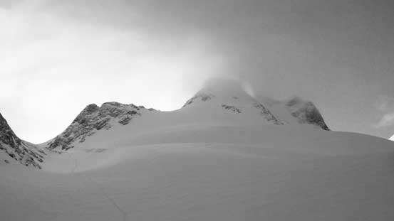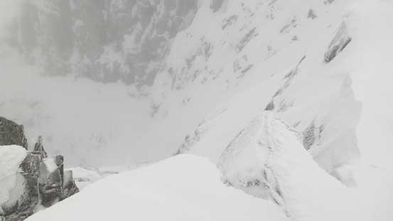 Unfortunately for me the cloud layered rolled in and I entered the world of white. No wind nor precipitation but I lost all the views. The funnel involved some sort of front-pointing on hardpacked snow up to 45 degrees and I cleared it soon. The summit ridge didn’t have massive cornices as described by other trip reports nor did I have to do a tricky traverse. I managed to stay almost entirely on the ridge crest (scrambling with crampons on) and made to the summit in short time. I waited for about 20 minutes but there’s no sign of improvement in weather…