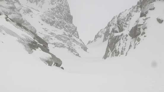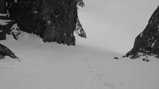 Around the col I dropped into a depression zone and plodded down to the entrance of Aussie Couloir (losing some elevation along the way). The couloir appeared insanely steep but I knew it’s always not as bad as appeared. I spotted a protected place about 50 m up the couloir so kept my ‘shoes on till that point. Ditching the shoes, switching to ice axe and crampons and then taking a short energy break I immediately focused on the climb ahead. A small moat was easily crossed and the lower couloir went at 40 degree or less. The middle section felt flatter than 40 degrees but as I approaching “the funnel” the grade steepened again.