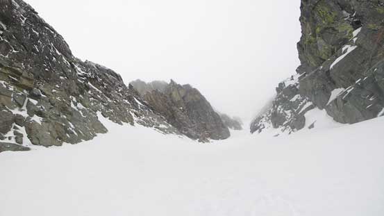 The summit ridge was easily descended and just before dropping into the couloir I spent some time tightening my shoe lace and taking out the ice tool. I brought it up so might as well use it anyway. With the ice tool the funnel was an easy down-climb with a bit of front-pointing here and there, and once into the main couloir it’s a fast plunge (albeit facing inwards) all the way down to where I ditched gears. Another minute or two was spent switching gears and then the couloir was cleared. The plodding back up to Joffre/Matier col felt tiring but once there I knew the rest would be a simply putting one front in front of another.