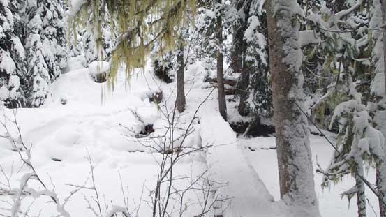 The soft powder on top of the hard old surface had created the ideal down-hill snowshoeing conditions especially for not-so-steep grade, as for each step down I could slide a feet or so forward without impacting too much on the knees. The best way to do it was plunging down side-by-side with my uptracks (not using the uptracks) and in no time I was off the upper glacier. The gully feature was easily descended and then the lower glacier was easily plunged and the next thing I realized I was already down by the moraine. The rest of the return along Cerise Creek wasn’t as fun as skiing but then I didn’t have to curse those uphill rolls.