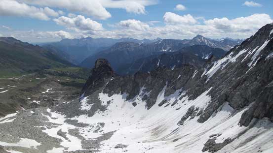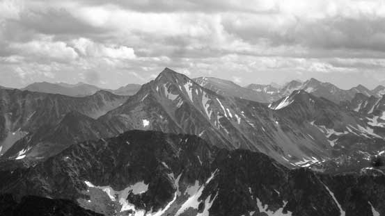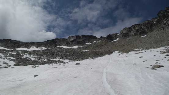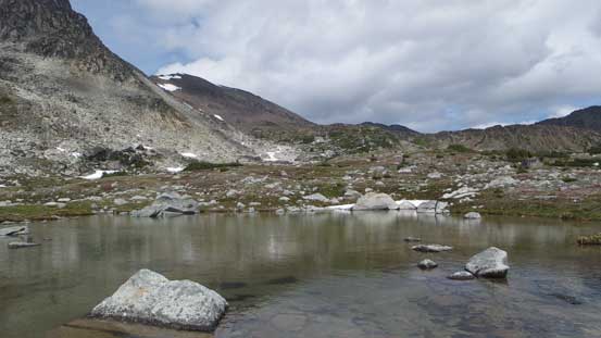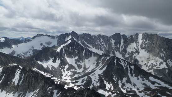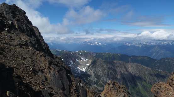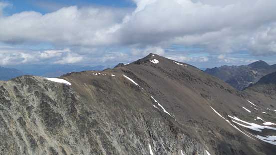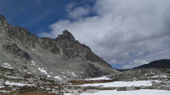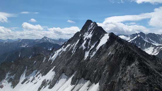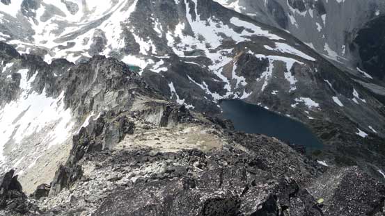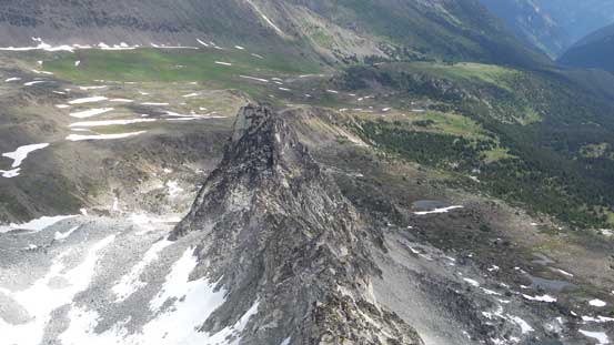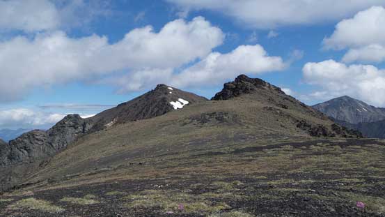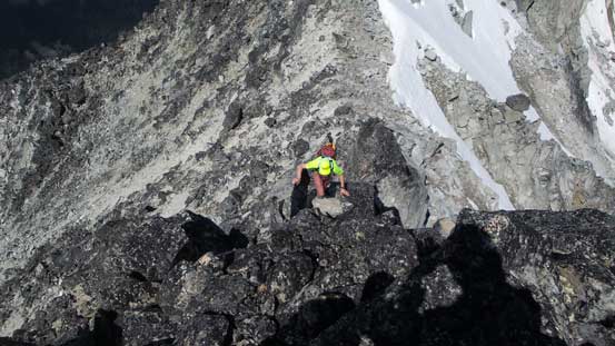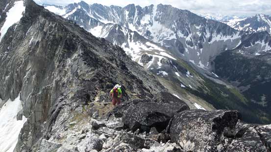 From Statimcets Peak the route follows the connecting ridge more-or-less and there’s actually not much worth documenting. We never detoured too far from the ridge. There’s one subsidiary summit to ascent up and over and near the top we opted to bypass on the south side. After that the ridge drops down towards Statimcets/Linus col and the geology transitions from the loose shale to the more solid granite boulders.