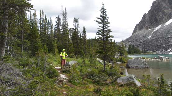 The summit stay was not very long as we still had a long drive back home awaits. The idea was to make a loop by dropping down the south ridge. After a while I spotted a possible short-cut descent down to the basin and then went for it. The loose scree made for some fun surfing and then the snow in the lower bowl also helped speeding up the process. In short time we were back to the treeline and then bushwhacked down to Holy Lake. This stretch was not very enjoyable but we did manage to avoid the worst bushwhacking. Then picking up the trail the rest of the descent was uneventful. The GPS came handy again to make sure we didn’t take any wrong side branch.