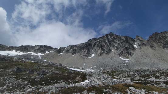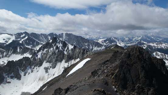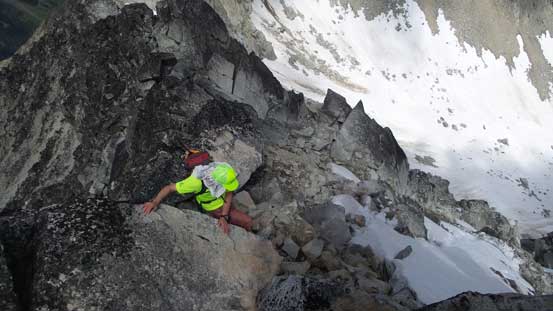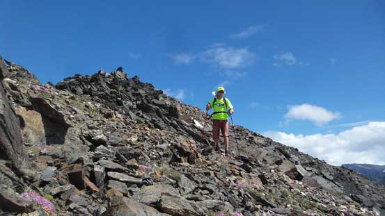 From Statimcets Peak the route follows the connecting ridge more-or-less and there’s actually not much worth documenting. We never detoured too far from the ridge. There’s one subsidiary summit to ascent up and over and near the top we opted to bypass on the south side. After that the ridge drops down towards Statimcets/Linus col and the geology transitions from the loose shale to the more solid granite boulders.