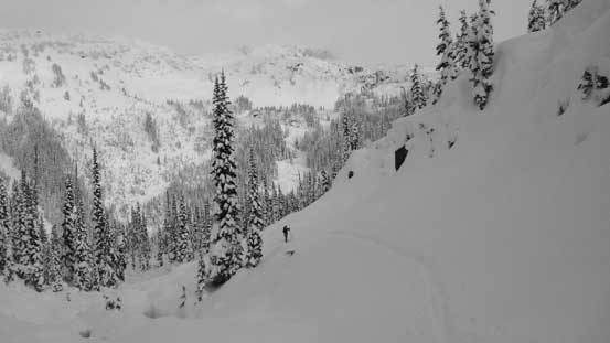 Now with only about half an hour of daylight time we knew there’s no way for us making to Lizzie Creek Cabin before dark, but Alex and Ben felt confident that with GPS navigation the final 300 m (vertical) slog could be done in the dark. Two years ago they got lost following the vague description in John Baldwin’s ski book and had a forced bivouac along the same approach and there’s no way we’d do that again. This time we decided to take the summer trail which (hopefully) could provide a faster and less confusing way up. It was, and wasn’t… For most of the time we could clearly follow the bright orange diamonds up which saved us a lot of route-finding, but I have to say that trail wasn’t quite designed for ski travel with sections being very steep (almost pointing straight up). We had to take skis off and boot-pack (knee to waist deep post-holing) for a few times and some large deadfalls were all require some sort of detours. Thankfully there weren’t that many alders in the old growth forest (except for one avalanche path). A few more hours into the death march slog we came around a corner and dropped into the “Gate of the Shangri La”, and another 20 minutes or so up along the creek we arrived at the cabin, frustrated and exhausted.