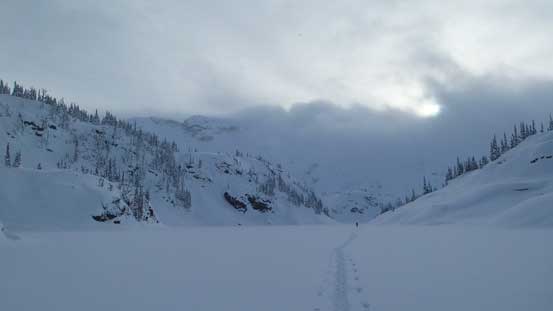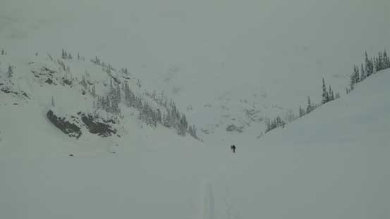 With the 10-hour approach done we knew the hardest day of this trip was over (and we could temporarily forget about the alders until a week later). We did some brief cleaning (no “giant rat” found as described by other parties) and sleep came easily for the night. The next morning we slept in till passing 8 am. The objective was to knock off Long Peak before a (supposed) storm blowing in the day after changing the avalanche conditions. As for Saturday (Day 2) it was still Mod/Low/Low but for the rest of this trip the condition was impossible to tell. The weather was cloudy with all the nearby summits soaked in and Alan wanted to have a rest day break, so it was only Alex, Ben and myself heading out. We skin’d up the climber’s left side of the Long Lake’s outflow drainage – easy except for one steep traverse near the Lake. Skinning across Long Lake took a while (as expected given the name of this lake), and shortly after that the wind started to howl and the weather closed in. Up the first steep roll onto a ramp system we were in a complete white-out, navigating mostly by GPS and the immediate terrain in sight.
