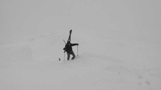 In this type of conditions we opted to the climber’s right option – aiming to crest the long SW Ridge as early as we could. But even that all the terrain in our immediate vicinity was big. Alex led up a steep gully to the right (lots of switchbacks and steep kick-turns) and then we crossed a gentler ramp/plateau feature. It was impossible to tell the exact as we were in a complete blizzard at this point, but we could tell that we did hit the SW Ridge soon. But then there’s one super steep roll immediately in front along the SW Ridge that we soon realized boot-packing was the only option. Skis strapped on the pack I led a line up the climber’s left side – convex, wind-loaded and steep (45 degrees or so at steepest) but it’s fairly short with not-so-bad run-out. The post-holing was terrible and I basically just swam my way up. About 2/3 of the way up a small surface slab released but I managed to anchor myself into the slope. We then traversed underneath the crown back to the right and managed to overcome this roll that way, only to realize there’s a second steep roll in front… Boot-packing again and this time we could stay more on the rocky terrain (slippery boulders!) and shortly after we finally made to the first highpoint along this long ridge.