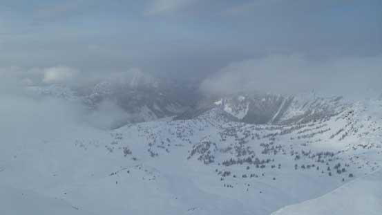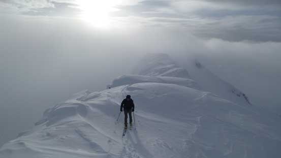 Long Peak is long… Our perseverance was rewarded by some temporary clearing in the weather. It seemed like we broke through the first layer of the clouds and the visibility had improved dramatically. There were lots of big cornices and after overcoming another false summit the ridge soon narrowed down. We were pleased with the improving visibility as the drop-off to the left (North) was massive had we messed up the cornices. The true summit was finally in sight but then there appeared to have a steep drop into the connecting col. Thankfully it wasn’t that bad as we side-slipped our way down. The other side was also easier than appeared and then it’s the summit celebration time.