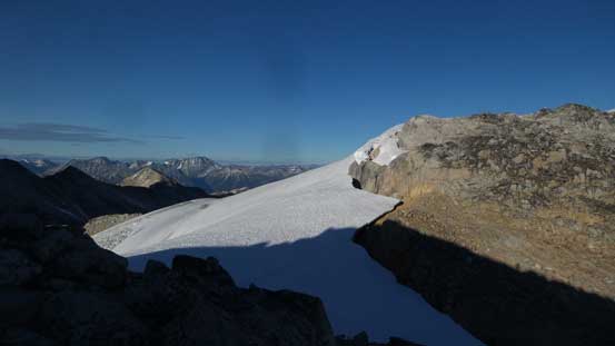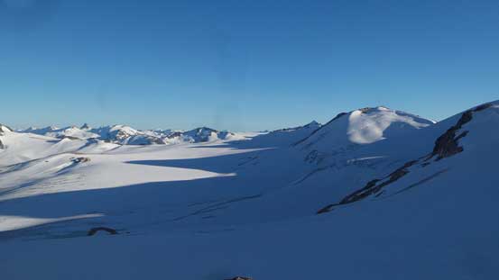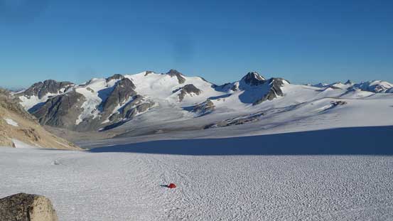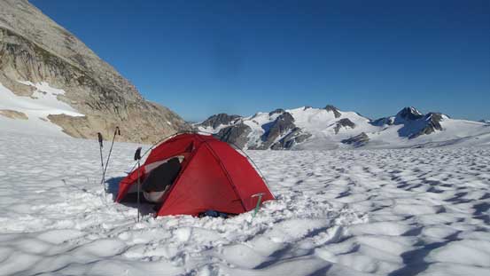 The descent back to camp was next to uneventful as we simply reversed our ascent route. Near the bottom I paid close attention on my GPS so that not to miss the exit point back onto the Madhorse Glacier. Camping on snow with a semi-leaking sleeping pad was pretty rough. I had to blow it up a couple times during the night as otherwise I was getting too cold. The next day we resumed our ascent of the primary objective – Overseer Mountain.