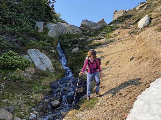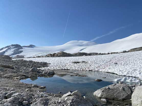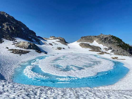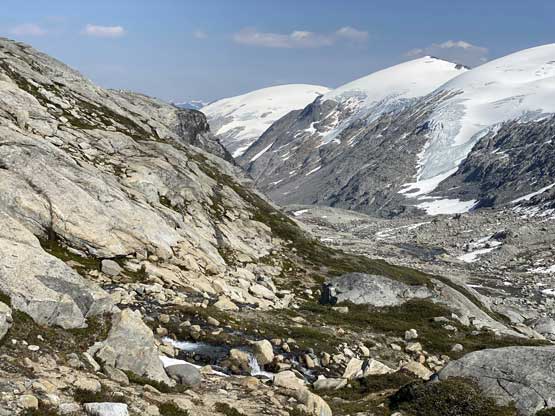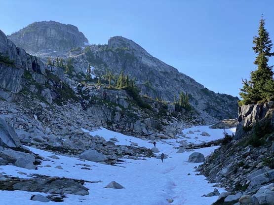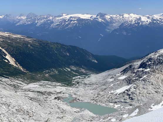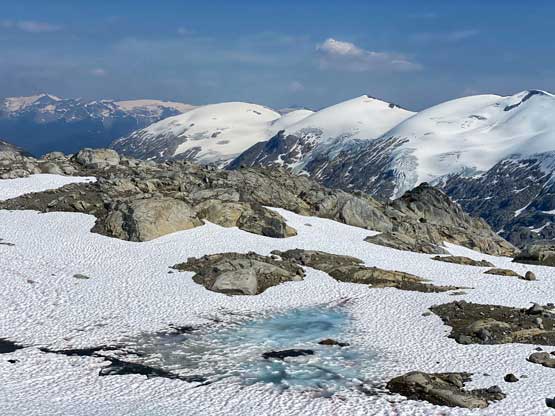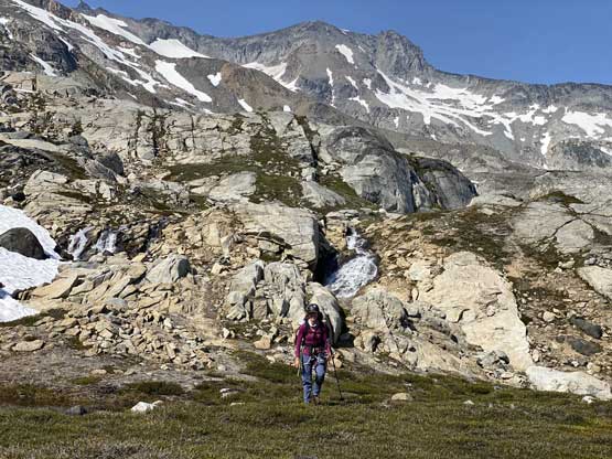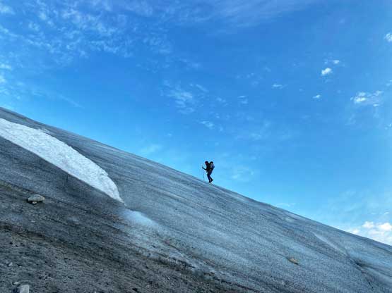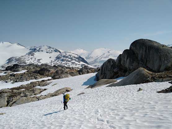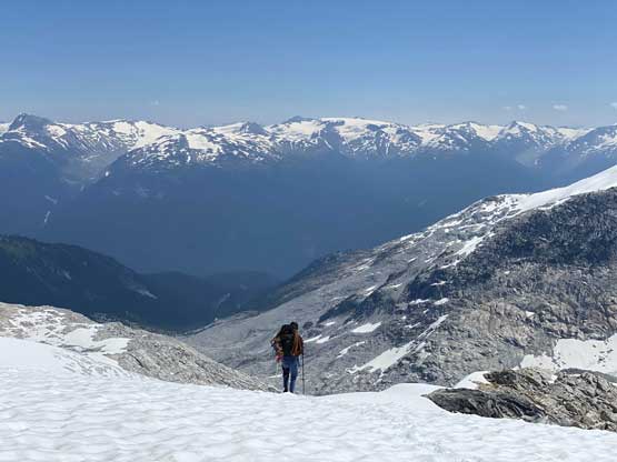 I did not linger too long on the summit because Ellie’s waiting and we still had a long day ahead. I reversed the exact route I took except for that crux zone. I bypassed the down-climb by making some zig-zags along chossy ledges and I also bypassed some down-climbing on snow by sticking to the choss. I knocked a shit down loads of rocks down onto the glacier below. Once back to the ditched gears I took my time melting some snow and meanwhile Ellie came down from Remora/Manatee col. The descent off this south side glacier was decently tame but then we faced a series of route-finding difficulties to drop into the headwaters of Meager Creek. There were lots of 3rd class down-climbing as the micro-terrain was confusing but after a while we started to just pick whatever route that made sense. We ended up descending towards skier’s left into the upper Meager Creek headwaters before making a long dash back right (west) with some elevation regain, into the upper Toba River headwaters.