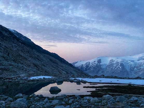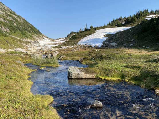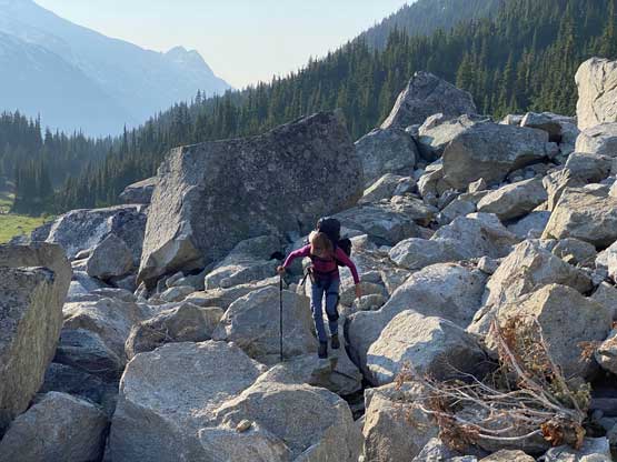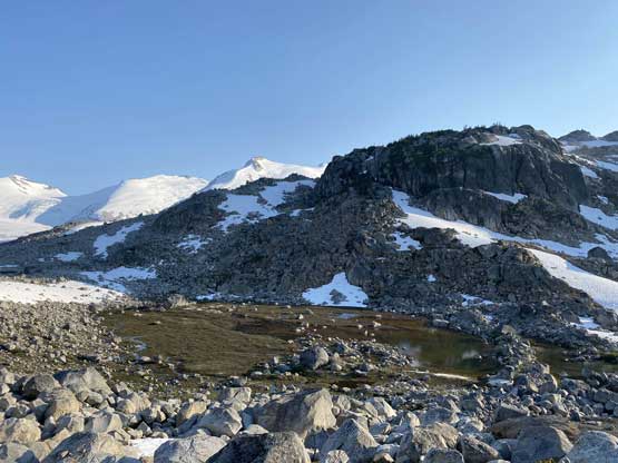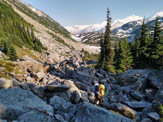 We took a long break before committing to the next stage, an unknown section of steep bushwhack down into Toba River headwaters before re-ascending towards that broad pass dividing with Elaho Glacier. This bushwhack was much harder than I thought with sections of vertical thrashing and a great deal of route-finding, but a while later we cleared it. We then traversed on mostly boulder fields and occasionally thick band of bush towards our destination of Day 3, sticking on the far left (north) side of the valley. We ascended all the way to the broad pass before finding out Jason and Rob had camped a little bit earlier beside a small lake. We then descended to the camp and had a relatively relaxed evening. The mosquitoes were brutal and that’s the only downside.