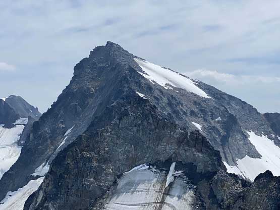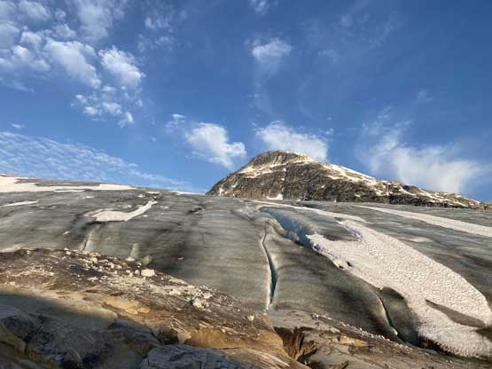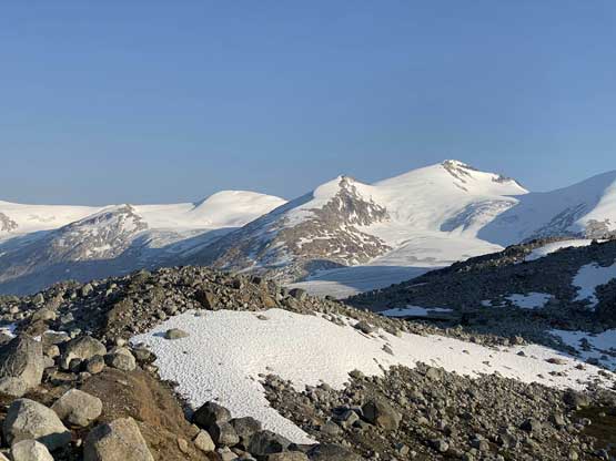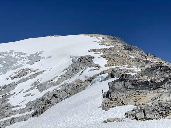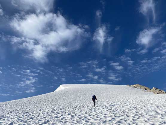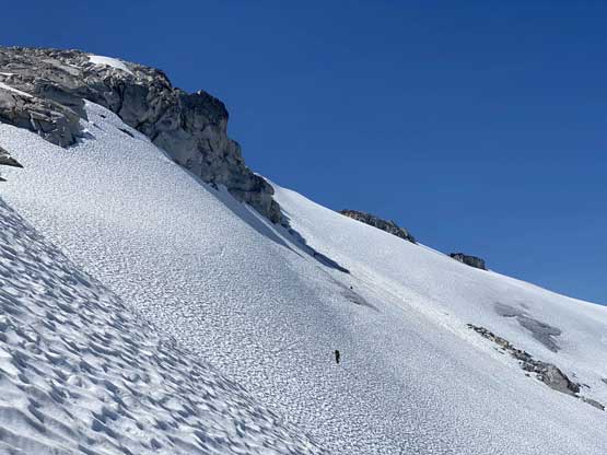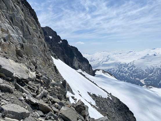 The first challenge was to gain the rock from this glacier. There appeared to have only a few options and the one I committed to turned out to be okay. The section of the rock immediately above this snow-to-rock transition was downright shitty but thankfully that did not last too long. I then had a long section of mostly easy, albeit unpleasant scramble and at times, it was easier to climb the steep snow patches right beside the rock. I made a diagonal traversing line out towards climber’s right aiming for the “central depression zone” on this massive face. Once into the middle of this depression zone I stuck more or less in it, dealing with a difficult 4th class step somewhere in the middle that I decided to not down-climb on the return. I made a mental note about a possible easier route further left (north). Above this step the grade of the terrain eased and in short time I made to the upper snowfield. The talus to the left of the snow was still loose so I strapped crampons on and just walked as far as possible on snow and ice. The last 20 m did have to be gained by hopping on talus and sure enough they were still decently loose.