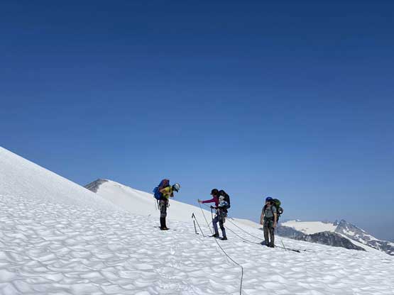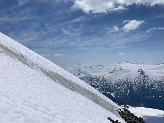 At this point we all realized that the size of our exit day was a hell lot bigger than anticipated but there’s nothing we could do other than plodding. We roped up with me leading across the next two pieces of glaciers and successively bypassing two more summits. There’s one mandatory 200 m elevation loss in the middle, which was unfortunate but that’s also the theme of Elaho Range traverse. Once the glacier’s finished we took another long break discussing route options and the choice was to ascend up and over a “crescent shaped peak” to the base of “Peak A”, which was the biggest of these bumps. The peak that we must shoot up and over turned out more difficult than we thought. We tried to use the rock ridge but soon gave up, but then the traverse on snow was steep for a long while. And finally at the base of “Peak A” I made the call to try an experimental traverse cutting across the south slopes for 2 horizontal kilometers as I figured if there’s a chance we could make it out, then this would be the way to go. There’s a bit of uncertainty near the end of this bypass but I decided to gamble on it. This of course turned out to be a great choice as the uncertainties (two gullies) turned out to be no worse than “class 2”.