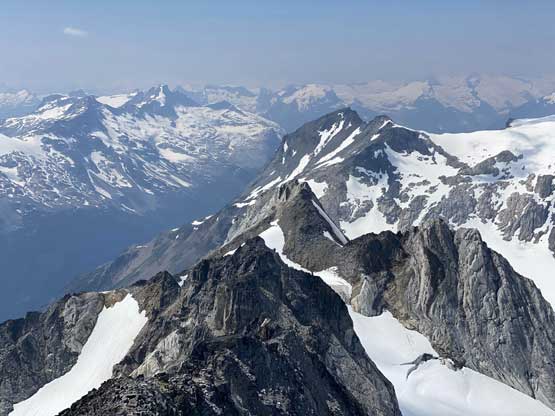 Looking back down that jagged towers ridge towards the tiny Remora Peak