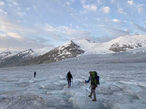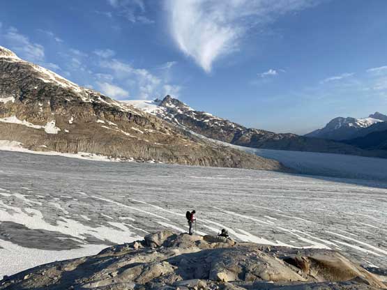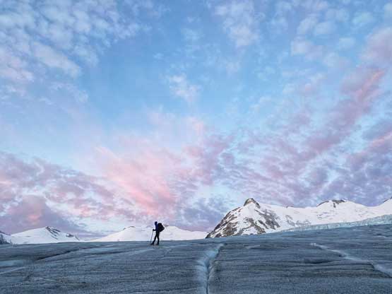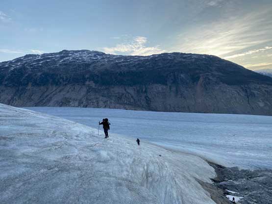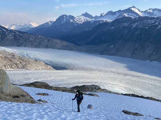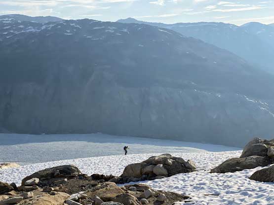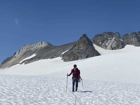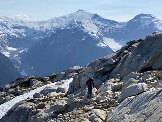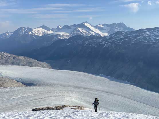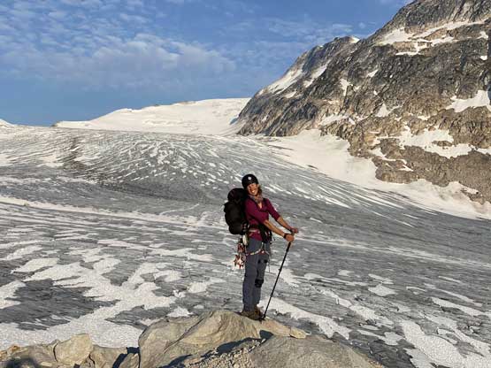 Ellie waiting for Rob to show up. Full stretch of Elaho Glacier behind