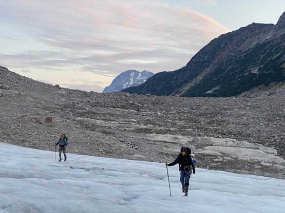 The more we looked at the maps the more we felt like the last day was going to be a massive push, so we agreed to wake up at 3:15 am to start in dark. We did manage to get going in the dark but only used head-lamps for 20 minutes or less. The first stretch was a confusing haul of boulder-hopping to ascend to the broad pass then descend the moraine to get onto Elaho Glacier. We tried to just walk on the ice for a bit but then decided to strap the crampons on. We had a lot of discussion about the few route options to get onto Elaho Range and in the end we opted for the closest with the least amount of ice-walk and the most amount of elevation change. This was actually my pick as well because we did not want to deal with uncertainties and the least amount of uncertainties should exist in the high country on snow. In retrospect we did pick a good choice to gain elevation quickly but then we picked a wrong ridge to ascend. After 500 m of steep grunting we unfortunately came to a dead-end with jagged rock towers blocking us and “Peak F” and after some frustrating inspection we determined that the only possibility was to lose 350 m elevation down east and re-start the grunt. Ellie and I went straight down and lost all of the elevation in one shot. Rob and Jason still tried to traverse around but in the end they also had to descend all the way down as there’s simply no short-cut around this ridge.
