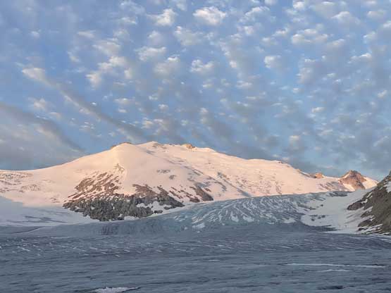 Finally it’s alpenglow time on the many sub-summits of Elaho Mountain