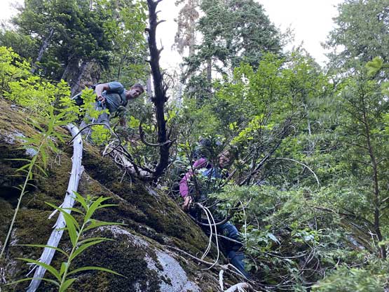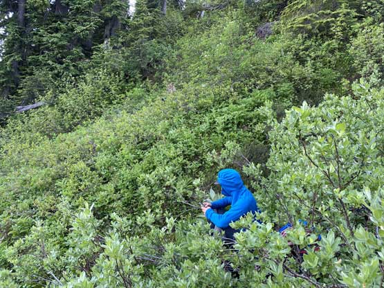 We kept the bypassing mode all the way to the first (frozen) lake that we encountered at 1800 m ish then tried our best to orient ourselves in the confusing micro-terrain in this treeline zone descent. There were gullies and ribs and the general bearing was somewhat against the natural trending of the terrain. We must aim for a rather-large lake at around 1050 m elevation and to get there we must deal with a hell loads of micro-terrain. The upper sections were already tricky enough and once diving into the bush we all realized this was going to be a miserable hell to thrash out. The bushwhacking was thick and the mosquitoes were horrendous and easily the worst I’ve experienced in SW BC. Usually by using Deet I’ve had great successes to deter the bugs but this time even the Deet failed. The terrain between 1150 m and 1050 m had a special deal with micro up-and-downs, ridges and gullies that by the time we finally came to that lake it was already head-lamp time. I tried to lead us down my intended route straight down aiming for the deactivated roads but more and more bluffs started to show up. We soon strapped the head-lamps on and I finally took Ellie’s suggestion here to aim straight down the forest gully/rib. The micro-terrain in my route would simply be impossible to navigate in the dark, so why not try a different strategy. This option was pretty simple for the start as we just needed to bomb down easy and open forest but then at 750 m elevation we had to make another decision. We inspected the option to follow the creek down but as expected, hell of alders and Devil’s Clubs pushed us back. The only other way was to traverse 50 vertical meters above the creek and side-hill for a few kilometers across the bush hell. Needless to say, it was not pretty. And just as we thought we were near the road we came to that secondary growth cut-block where “BW4” bushwhack awaited. Jason and I eventually came out of the hell at around 1 am onto a walkable road but still waits bands of thick alders to push through, and eventually made it out at 1:30 am, 21 hours after starting the dark. Ellie’s friend Nick was right there waiting for us (massive thank!). Ellie and Rob eventually made out two hours later and meanwhile, Jason and I had already set up tents to catch some rest.
