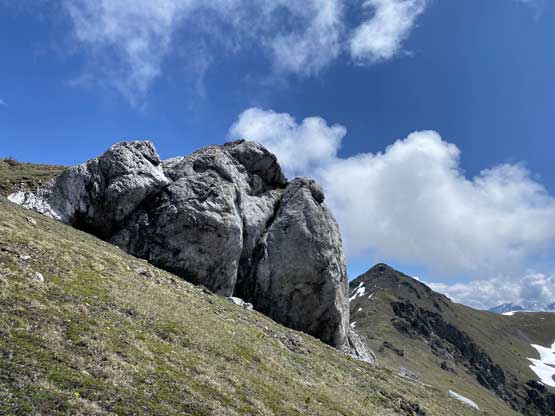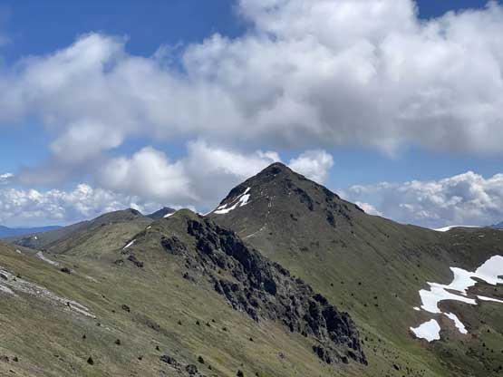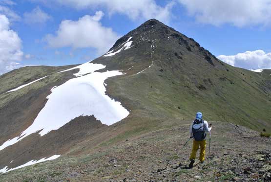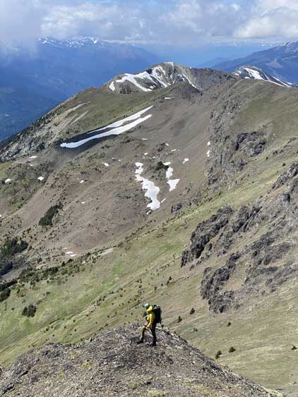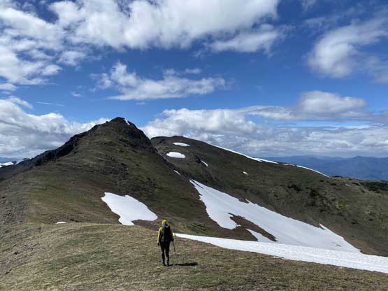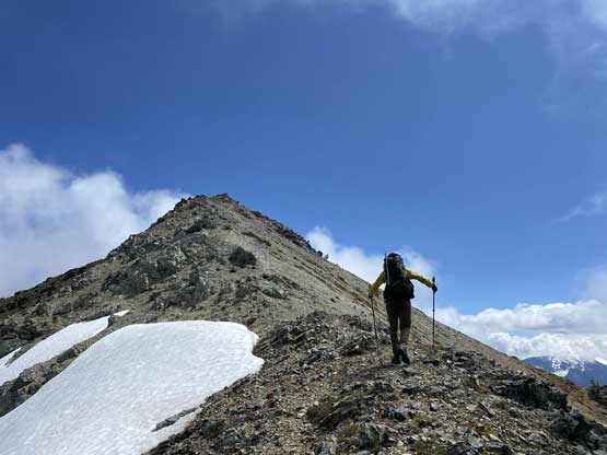 We took a long break and resumed the ridge rambling. The next stretch had a few mild scrambling and narrow steps but we also started to see some forms of a trail. The trail was too good to believe as just an animal path but it probably just is. Once rambling over the next bump we found finally see our objective and the terrain had transitioned into alpine meadows. We easily bypassed the next bump and ascended the following bump with some scrambling.