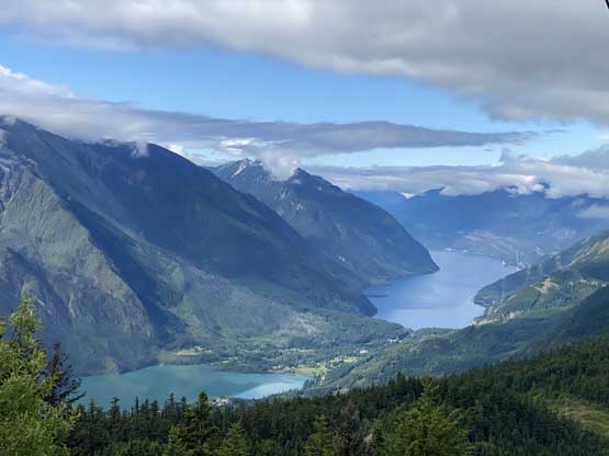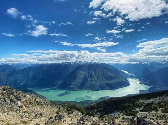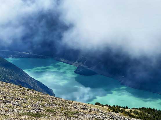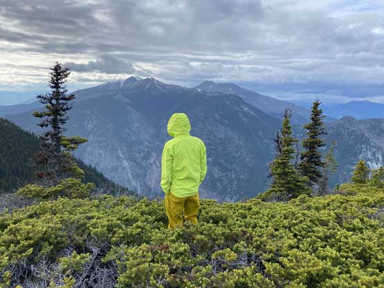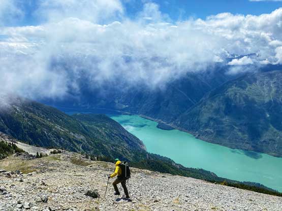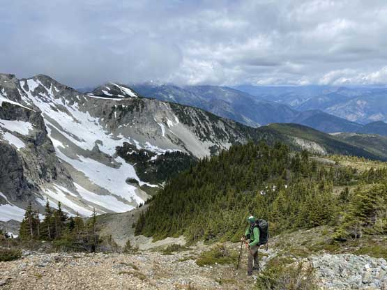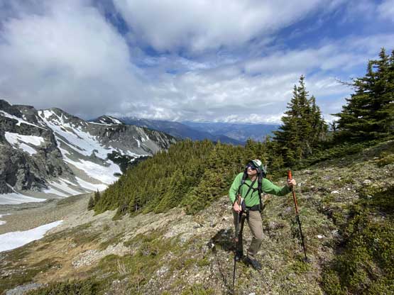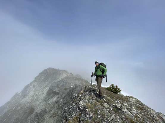 The parking aren’t wasn’t very spacious and could fit two or three trucks at most. We were the first ones arriving so had no problem taking the most obvious spot. The trail was very obvious and brought us to the treeline in under 15 minutes and within half an hour we had arrived at the first highpoint on Mission Ridge, unofficially known as “Geodedic Peak” on bivouac.com. The weather had been cloudy so we continued the ridge rambling towards the next bump, where we were treated by some intermittent views down towards Seton Lake.