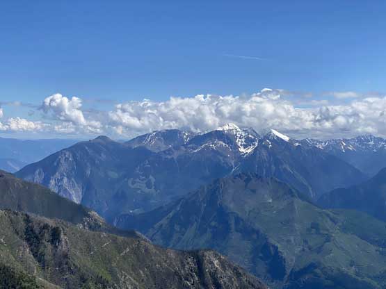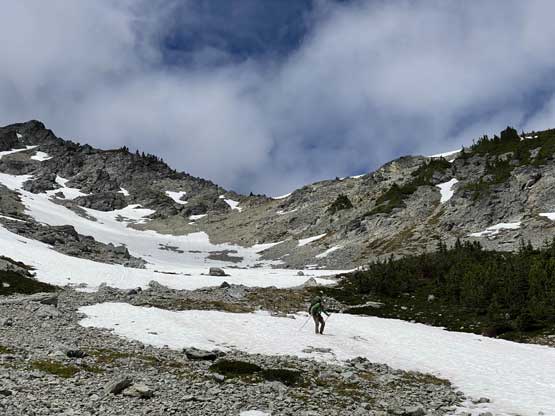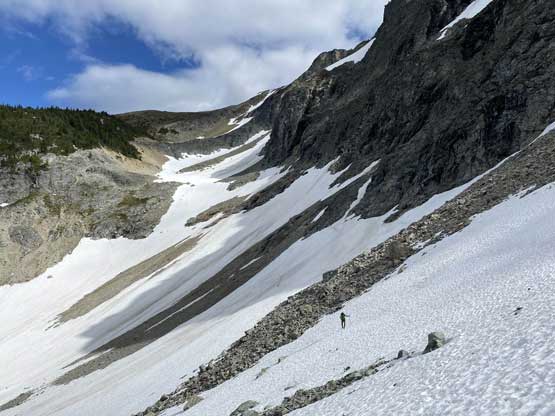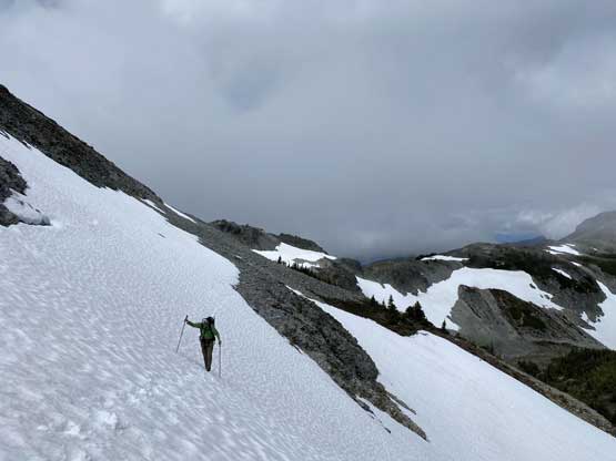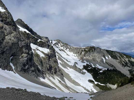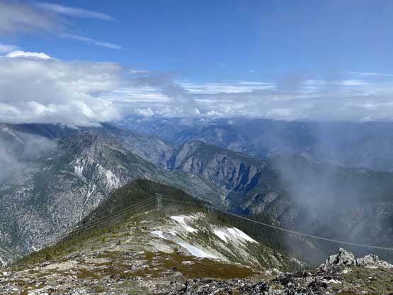 I had read Fred Touche’s trip report on bivouac.com about a technical notch on the NW Ridge of “Puck Peak” and the recent Instagram beta confirmed that. We had no interest in doing unnecessary work so to bypass that notch we traversed around the north-west side of “Puck Peak” and descended more than 150 m down into a bowl, and regained the elevation on either snow or scree. This route brought us to the summit of “Puck Peak” via the broader NE Ridge and the views were again, intermittent.