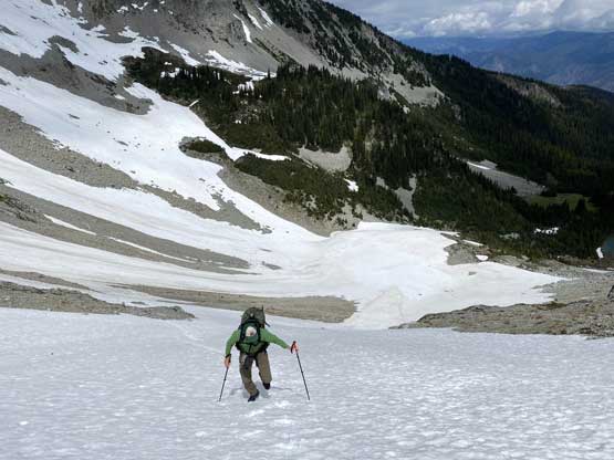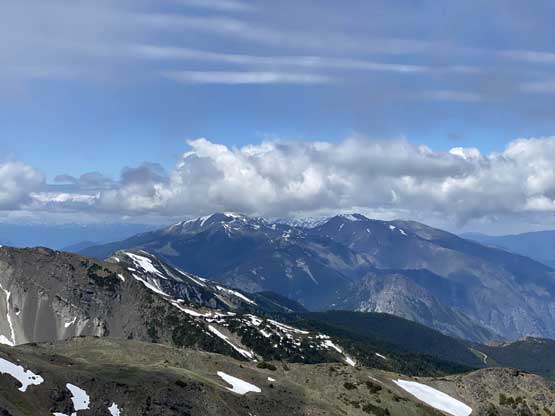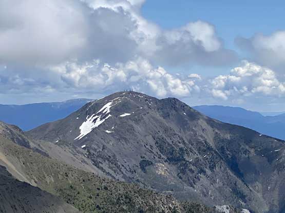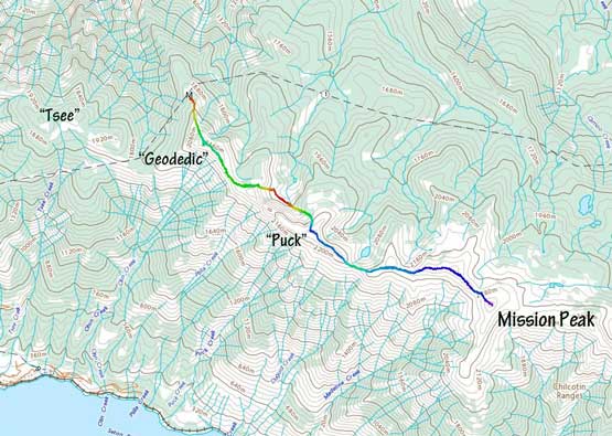 For the descent we decided to just reverse our route without doing any unnecessary work. We bypassed some of the bumps and plodded over the others. Once back onto “Puck Peak” we resisted the temptation to explore the ridge and just plunged down into the bowl, and slogged back up to the NE Shoulder and then slogged up the south ridge of “Geodetic Peak”. We now could see the views from this minor bump. We saw a huge group of ATVers summitting “Geodedic Peak” about half an hour ago and opted to rush back to the truck to make sure they didn’t smash our windows. The worrisome turned out to be unnecessary. We then drove to the radio tower on “Tsee Peak” the lowest bump on the NW end of Mission Ridge and easily bushwhacked to its highpoint.