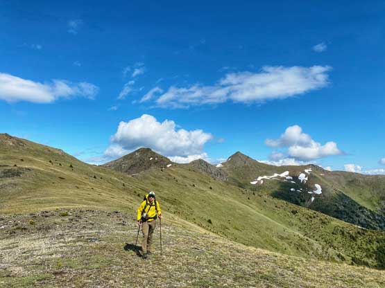 We took a long break and resumed the ridge rambling. The next stretch had a few mild scrambling and narrow steps but we also started to see some forms of a trail. The trail was too good to believe as just an animal path but it probably just is. Once rambling over the next bump we found finally see our objective and the terrain had transitioned into alpine meadows. We easily bypassed the next bump and ascended the following bump with some scrambling.