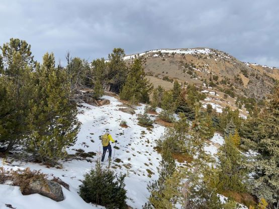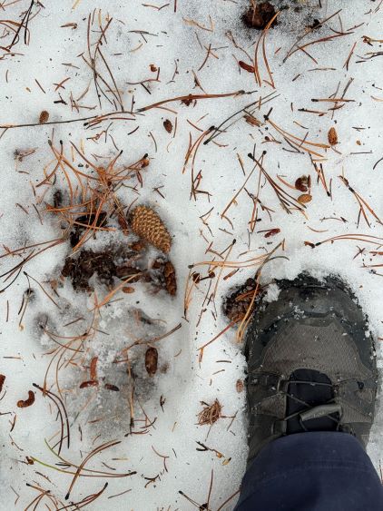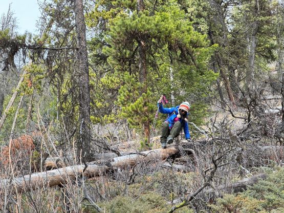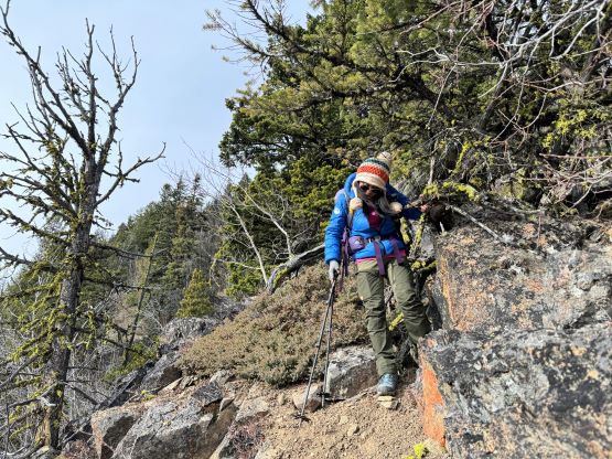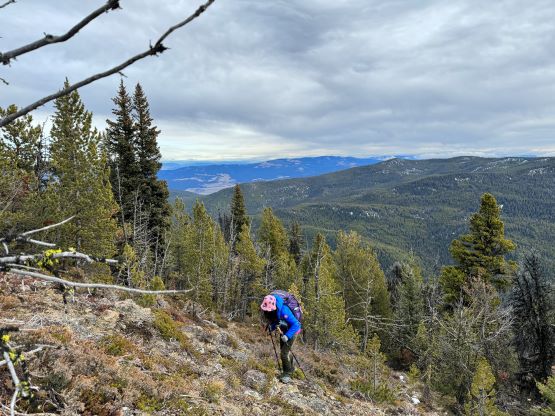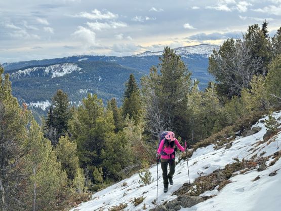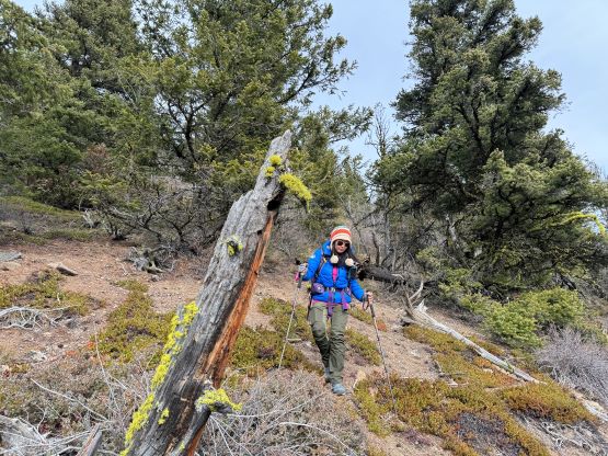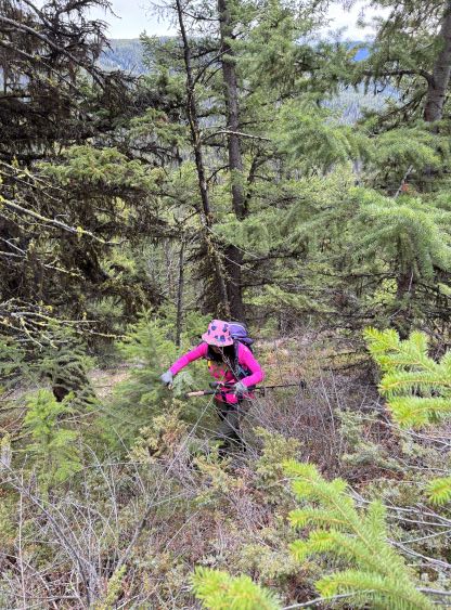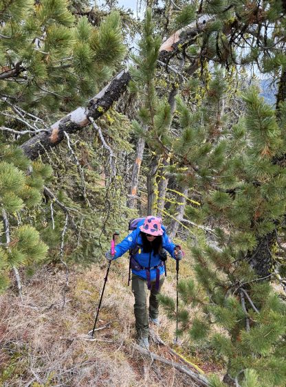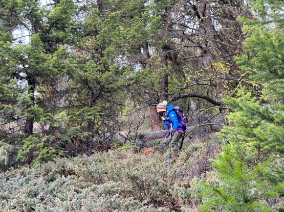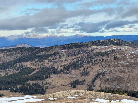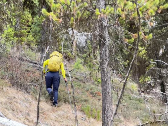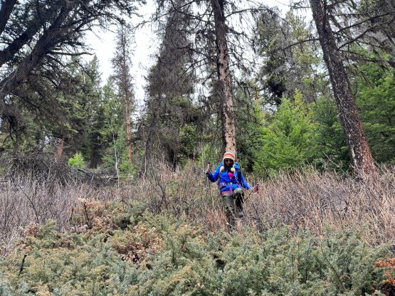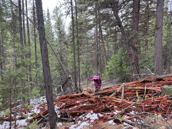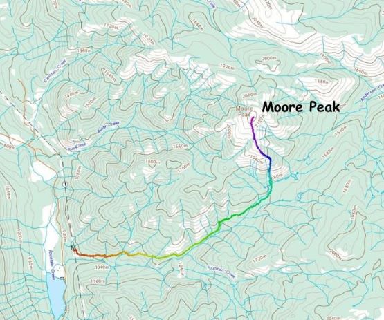 I had a few route choices in mind when planning this exploratory route and the most direct option was to ascend the steep south-facing slopes directly above Peanut Lake to gain the broad S/SE Ridge of Moore Peak. It was not possible to tell from satellite images if this slope involves bluffs and the contour lines were looking quite scary, but in the end it turned out to be trouble-free. There was some minor bushwhacking over pick-up-sticks but the going was mostly in open forest. The slope angle was actually not insanely steep nor did we encounter any notable scrambling section. We did take a few breaks as the grunt was overall very steep. After gaining the SE Ridge we turned climber’s left and plodded into the treeline on the south ridge. We encountered snow up to only ankle deep so the boots and the crampons had become training weight. The final 100 m ascent to the summit was done in open terrain and we actually got some nice views despite the iffy weather forecast. The summit was unfortunately cold and windy.