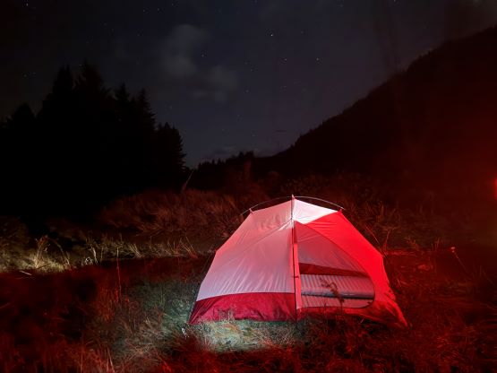 Due to the active weather in the past few days I was not able to predict the amount of snow in the mountains, so we decided to bring everything including snowshoes in the truck. In the end we managed the entire ascent in just trail runners. This year’s El Nino had surely done some impacts that all of the snow that fell a week ago had melted, and the recent precipitation had dumped nothing but liquid form of H2O, at least in this part of the range all the way up to the summit level. Kate and I left White Rock at around 8:45 pm and we encountered heavy rain including some deep puddles while driving up Highway 1 in Fraser Valley. I pulled over in Hope to check the radar maps and sure enough there’s a “severe weather” warning for the area, that up to 60 mm of rain had been recorded since the afternoon. Thankfully the area north of Lytton was mostly dry and by the time we got to Fountain Valley we could see nothing but stars in the sky. The short spur road that goes to the trail-head was in a rougher shape than I was hoping for (4×4, high clearance necessary), and it was difficult to find a spot to park the truck and pitch the tent. We eventually settled on a not-so-great pull-out next to the power lines and Kate showed me her massive-ass sleeping pads for added luxury.