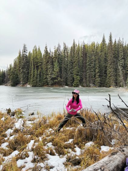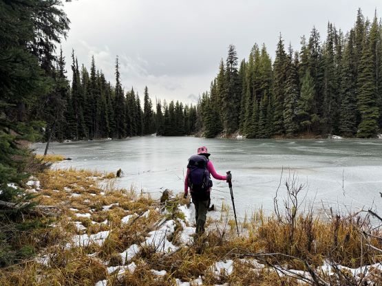 The alarms were set at 6 am but I turned them off and decided to sleep in for an hour. It was very easy to get lazy on a car-camping trip especially if the morning’s cold. The bright side of waking up late was that I could now see the mountains and make the in situ decision to leave the snowshoes in the truck. I still opted to carry the mountaineering boots and crampons just to be 100% sure but I was hoping to manage the entire ascent without them. Kate brought some pre-cooked breakfast kept in vaccum mugs and I thought that was an excellent idea. I hated eating cold food but I also disliked getting up in the chilly morning to cook, so Kate brought the perfect solution. The 6-7 km trail to Peanut Lake was in a much better shape than anticipated, that it was almost without any notable obstacle. The trail was also surprisingly not overgrown but does involve fair amount of elevation gain. We marched to the frozen lake in under 2 hours. The lake itself was not very attractive but we took our time taking photos nevertheless.