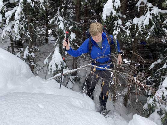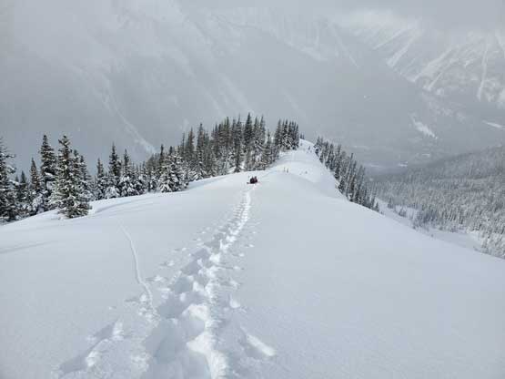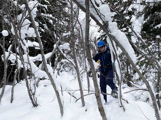 Thank to the previous party’s tracks I decided to use light gears, wearing only “winter hiking boots” and the women’s 25′ snowshoes. I briefly considered short-cutting to hit the logging road but opted to just walk to the standard parking lot. The snowshoes had to be strapped on almost immediately after getting onto the logging road, even though it had seen fair frequent snowmobile and skier’s traffic. For the next 1 hour and 40 minutes we plodded at a fast pace, covering 8 km distance and around 450 m elevation gain. We correctly located the “old logging road” that Al mentioned to me on our Facebook chat, and followed their tracks into the brushes. There was some degree of bushwhacking in alders, but with the tracks nothing was too outrageous, although the fresh snow on the alders did make the going a bit annoying. It seemed to me that Al’s group was confused about where exactly to leave the road judging by the meandering tracks they made. For us however, all we needed was to just follow. There’s no need to add more confusion by finding our own route. The next 400 vertical meters in the forest was as steep as I was expecting, but again due to the tracks our task was easy. We gained elevation on a rapid pace and in short time we arrived at the treeline and decided to take our first, and the only break of the ascent.