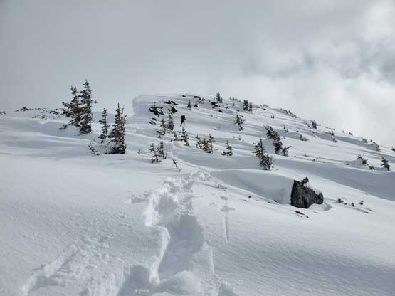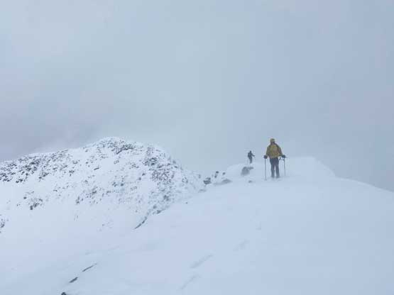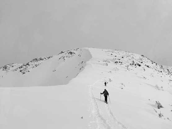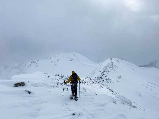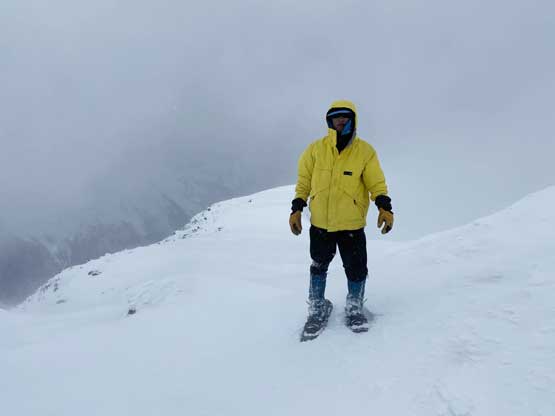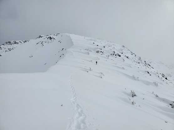 Jake went ahead breaking more trail while Selena and I opted to force in more donuts and water. A while later we caught up to Jake and suddenly bumped into a group-of-three snowshoeers coming up from a different way, possibly via or near Al’s group’s descent route. We chatted briefly and then we went ahead. They had been breaking trail the whole way up from Caspar Creek and it seemed like our ascent route was the easier choice. As we ascended higher and higher towards the summit ridge the weather deteriorated and the wind picked up. There were a few steep steps that needed to be bypassed on the climber’s right side but there’s nothing exposed nor difficult. The traverse across the summit ridge was windy and very cold making me regretting for not bringing goggles nor the balaclava. I had to cover my face using my gloves for most of the time and needless to say, the going was pretty miserable. We also had zero view from the summit thank to the blizzard conditions.