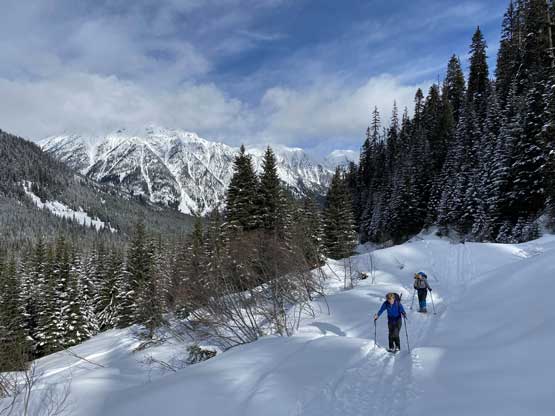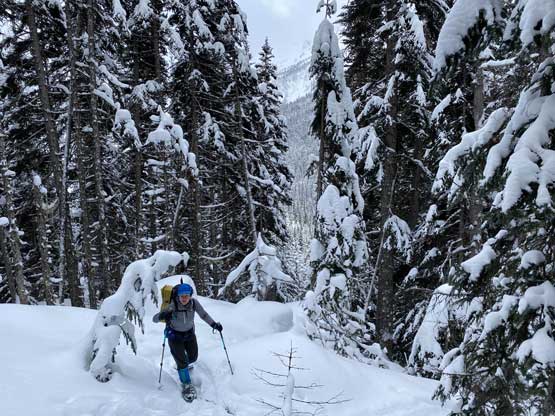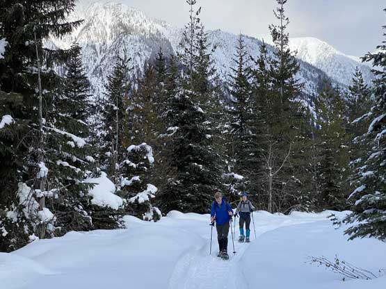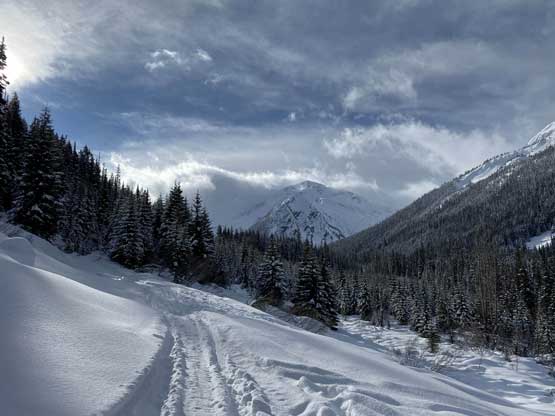 A couple days before the weekend my friends Al and Mel had just packed down a set of tracks on snowshoes, along with Nathan on skis. I unfortunately could not join their trip due to work, but the weather had been relatively stable with only inches of new snow on Saturday, so it made perfect for me to take advantage of their work on Sunday. It took me a while to find partners but eventually Jake and Selena decided to join, coming all the way from Seattle. The weather forecast was worse in the Cascades and they wanted to seek sunshine. They would stay till Monday (which had the better weather forecast) but I again, could not take the day off due to work. In the morning I woke up at 5 am and met Jake and Selena in Pemberton’s McDonalds at around 8:30 am. This was their first time ever visiting Pemberton. We all piled into my truck for the short ride up the Duffey Lake Road. The small parking lot at the start of Caspar Creek FSR was completely jammed so we had to park about 100 m downhill on another pull-out.
